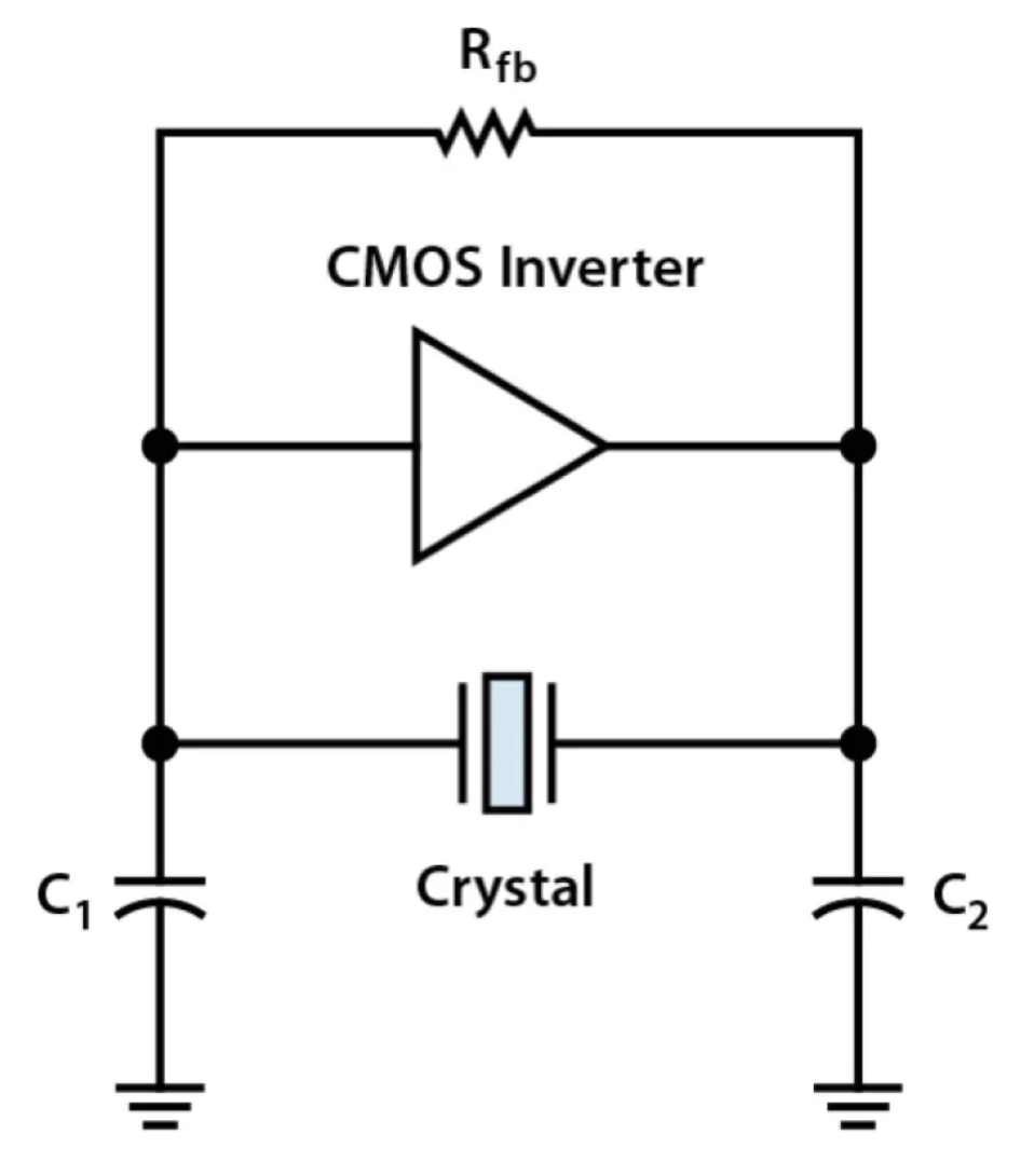 無源晶振本質(zhì)上只是一個石英諧振器件,它不包含振蕩放大電路,因此不能主動輸出數(shù)字邏輯電平。真正產(chǎn)生波形信號的是外部振蕩電路。在絕大多數(shù)MCU應(yīng)用中,內(nèi)部采用的是皮爾斯Pierce振蕩結(jié)構(gòu):通過反相放大器與外接晶體及負載電容形成閉環(huán)反饋網(wǎng)絡(luò),使系統(tǒng)在晶體諧振頻率點滿足振蕩條件,從而輸出穩(wěn)定波形。