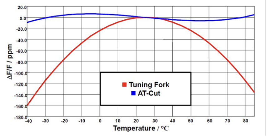 音叉晶振主要工作在32.768kHz,振動模式為彎曲振動,結(jié)構(gòu)細長且柔性較強。其典型驅(qū)動功率僅約0.1μW,對驅(qū)動能量極為敏感。溫度特性呈負二次曲線,近似為:-0.035ppm × (T-25)2。這意味著頻率在25℃附近最穩(wěn)定,溫度偏離越大,誤差增加越明顯。